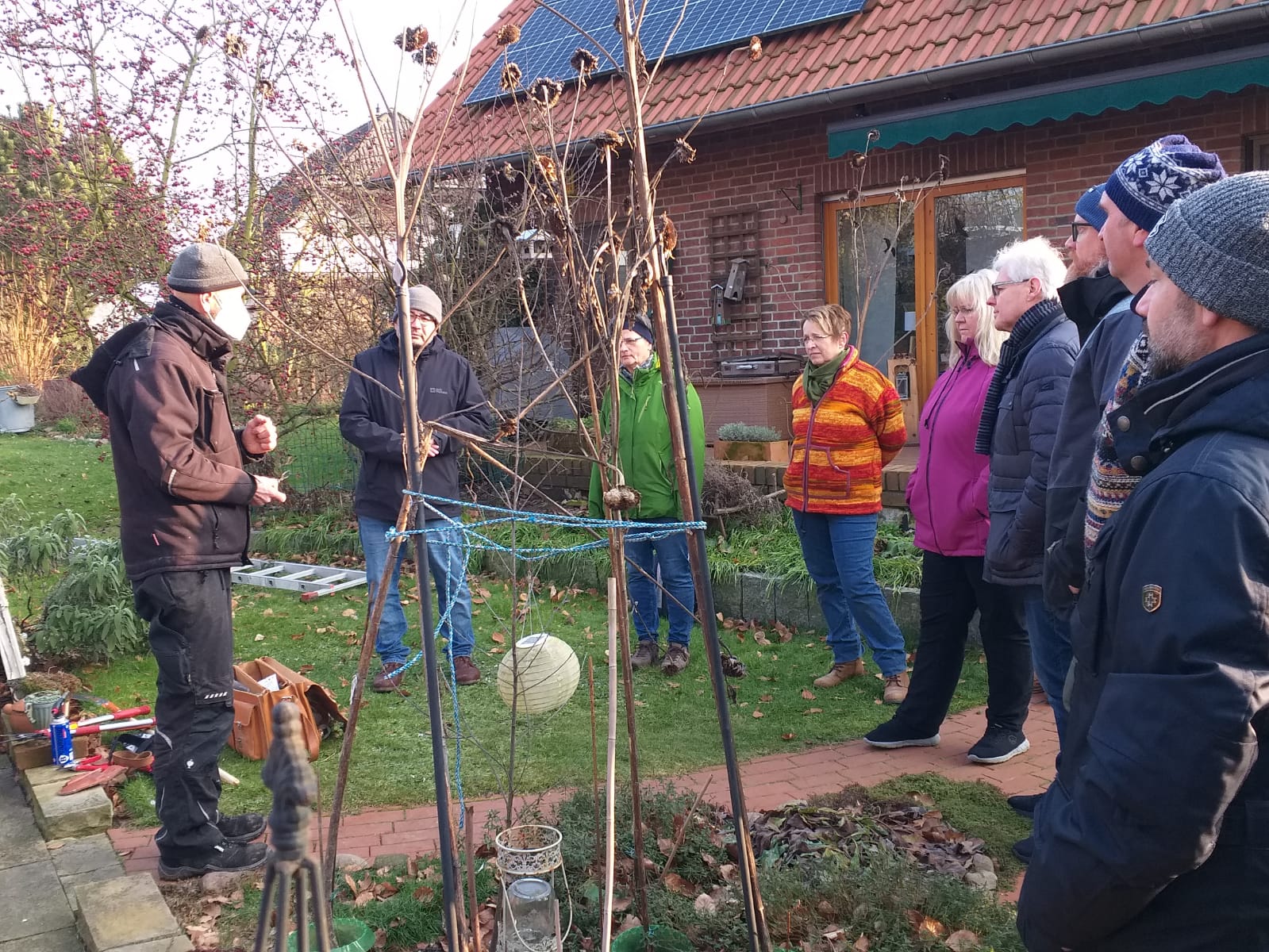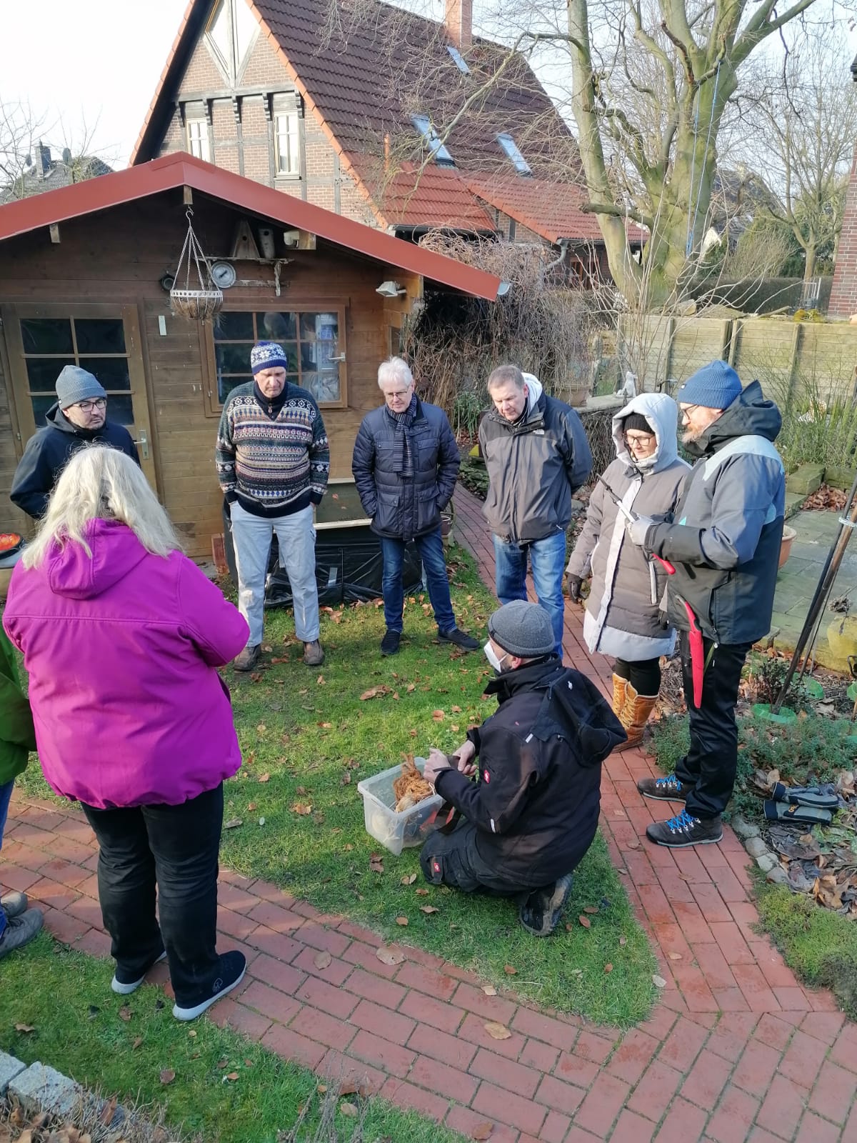 12 interessierte Wettmershäger ließen sich bei Eiseskälte am 08.02.2025 von Herrn Karwehl das richtige Vorgehen beim Obstbaumschnitt erklären.