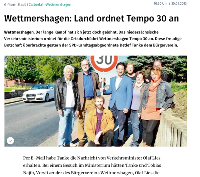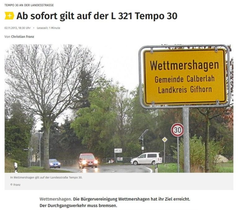 Das Durchhaltevermögen hat sich gelohnt, Ende September 2013 ordnete das niedersächsische Verkehrsministerium das Tempo 30 für die Ortsdurchfahrt Wettmershagen an!