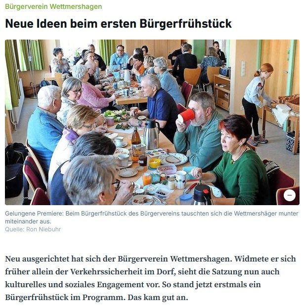 Wiederkehrende Veranstaltungen wie unser legendäres Bürgerfrühstück oder Weinfest. Es gibt aber auch Kinoabende für Groß und Klein, Informationsveranstaltung z.B. über Einbruchschutz oder zum Thema Gesundheit, sowie Workshops zum Thema Fotografie.