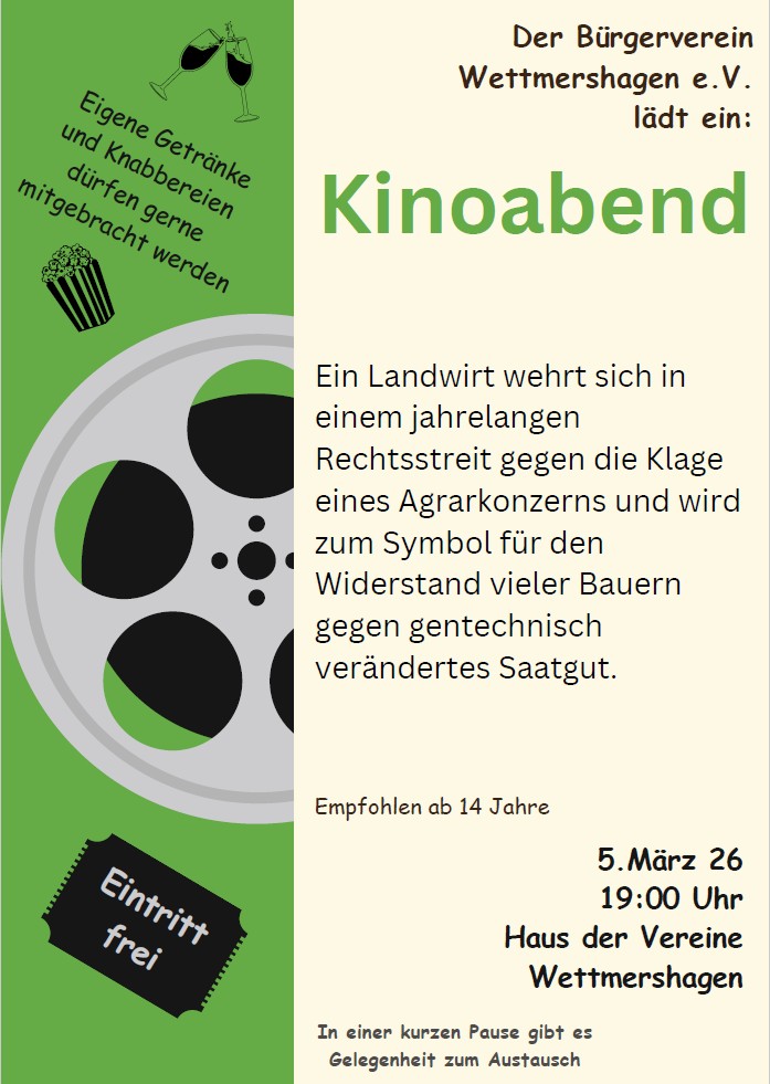 Bringt gerne eure eigenen Getränke und Knabbereien mit und genießt einen gemeinsamen Filmabend im Haus der Vereine